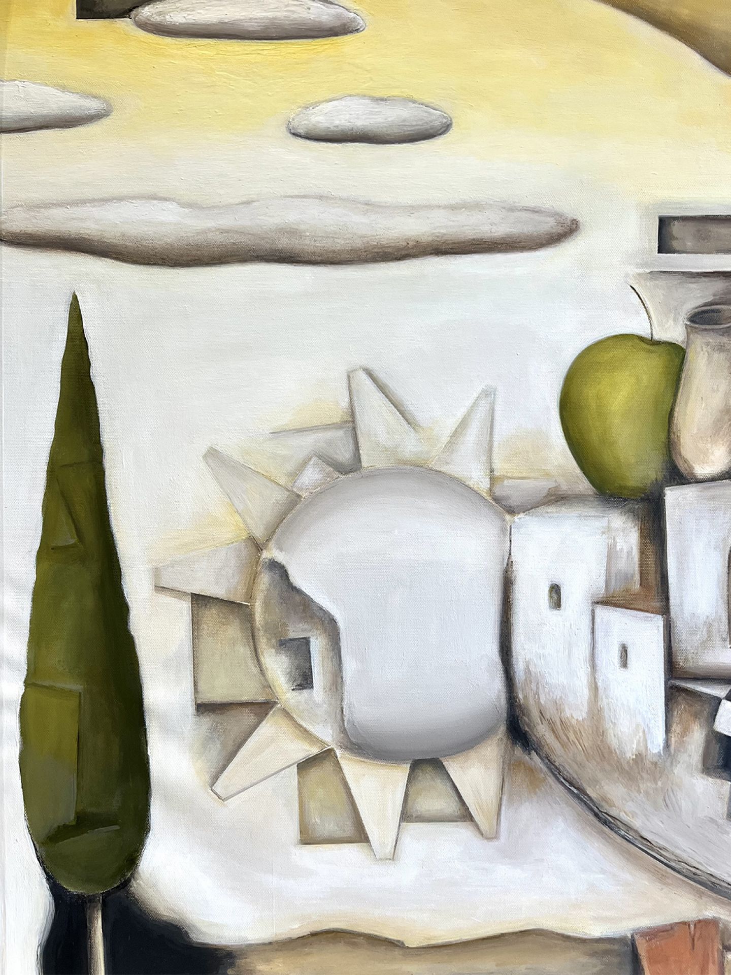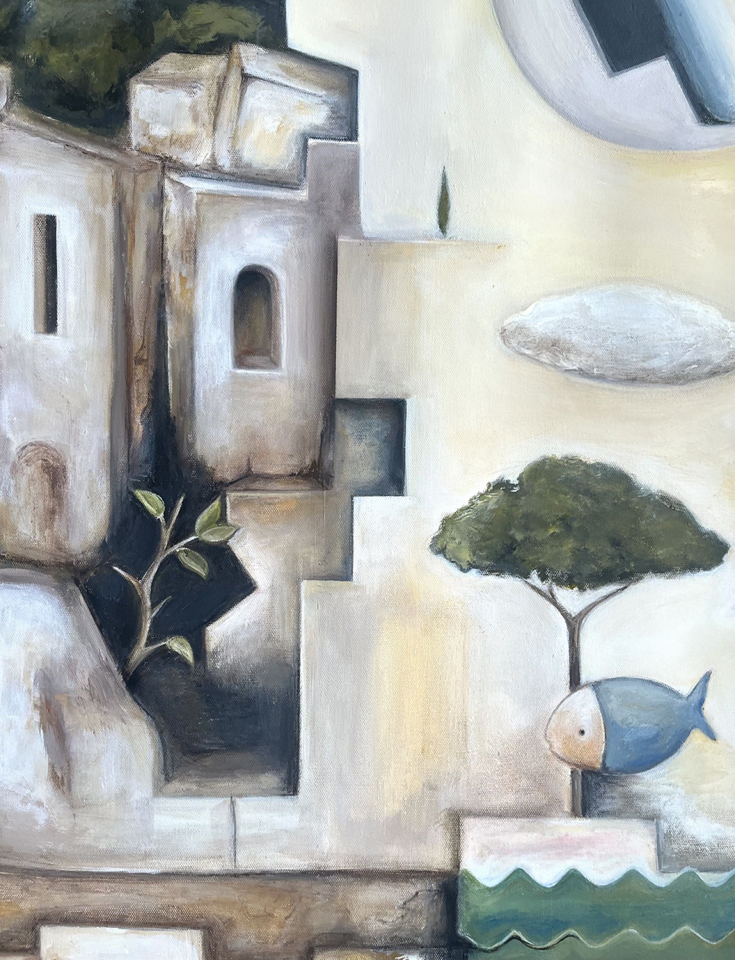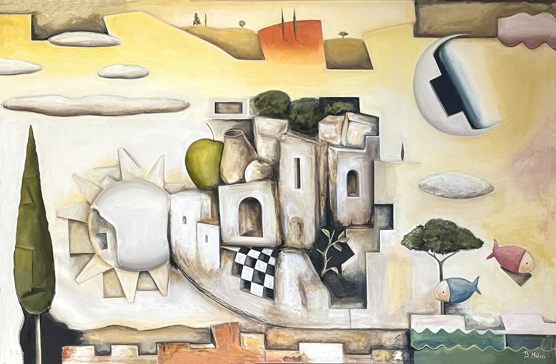 Barbara Meduri urbanizza il sogno. Architetto di formazione, qui firma una planimetria sentimentale dove il borgo mediterraneo diventa plastico di memoria. Case, calcare, archi come feritoie, un sole a rilievo che sembra una cupola scheggiata. Una luna sezionata come una sezione tecnica. Tutto è progetto e fiaba insieme. La tavolozza è di tufo, panna, ocra e latte di calce. Il verde del cipresso fa la sentinella, l'apple still life fa da complesso all'anfora. Contrappeso, misure, pesi e volumi. Poi lo scarto, pesci che volano, nuvole a mensola, una scacchiera infilata tra i vicoli come se il destino si giocasse a pedine. Utopia e realtà, la sua tesi, qui scivolano una nell'altra senza chiedere permesso. La composizione procede ad incastri senza prospettiva consolatoria; più sezione che veduta; più cantiere interiore che panorama. Il nero dei varchi apre cavità; il rametto che spunta dalla roccia che è un permesso a costruire rilasciato dalla natura. C'è ironia gentile; questa lottizzazione dell'anima funziona meglio di molte lottizzazioni reali. Meduri modella il quadro come un modellino mentale; riduce , semplifica, ordina poi sposta un elemento e lascia che il gioco inizi. Il risultato è un presepe laico dove ogni cosa sta al suo posto e intanto sogna un altrove. Domanda finale e secca : dove abiti quando sogni? Barbara suggerisce una risposta: in una città sospesa che non chiede residenza ma che pretende appartenenza.