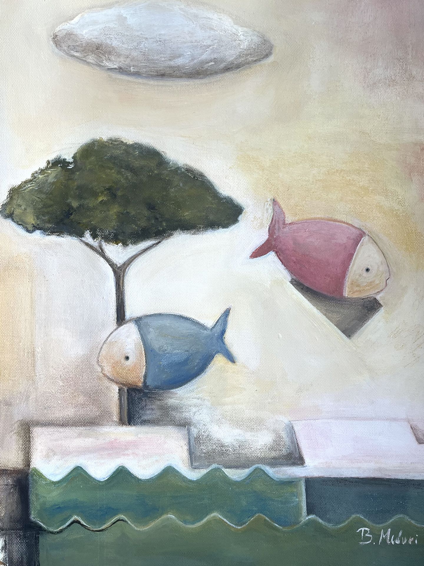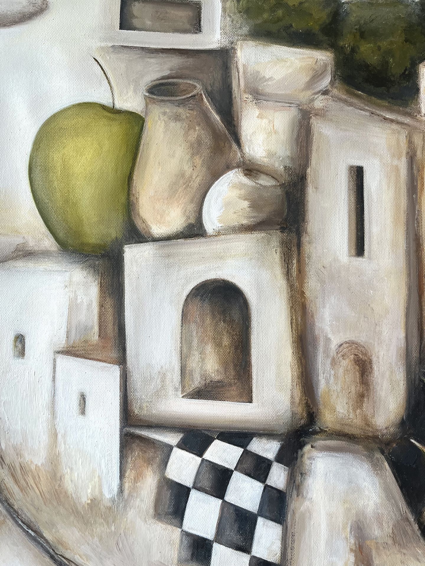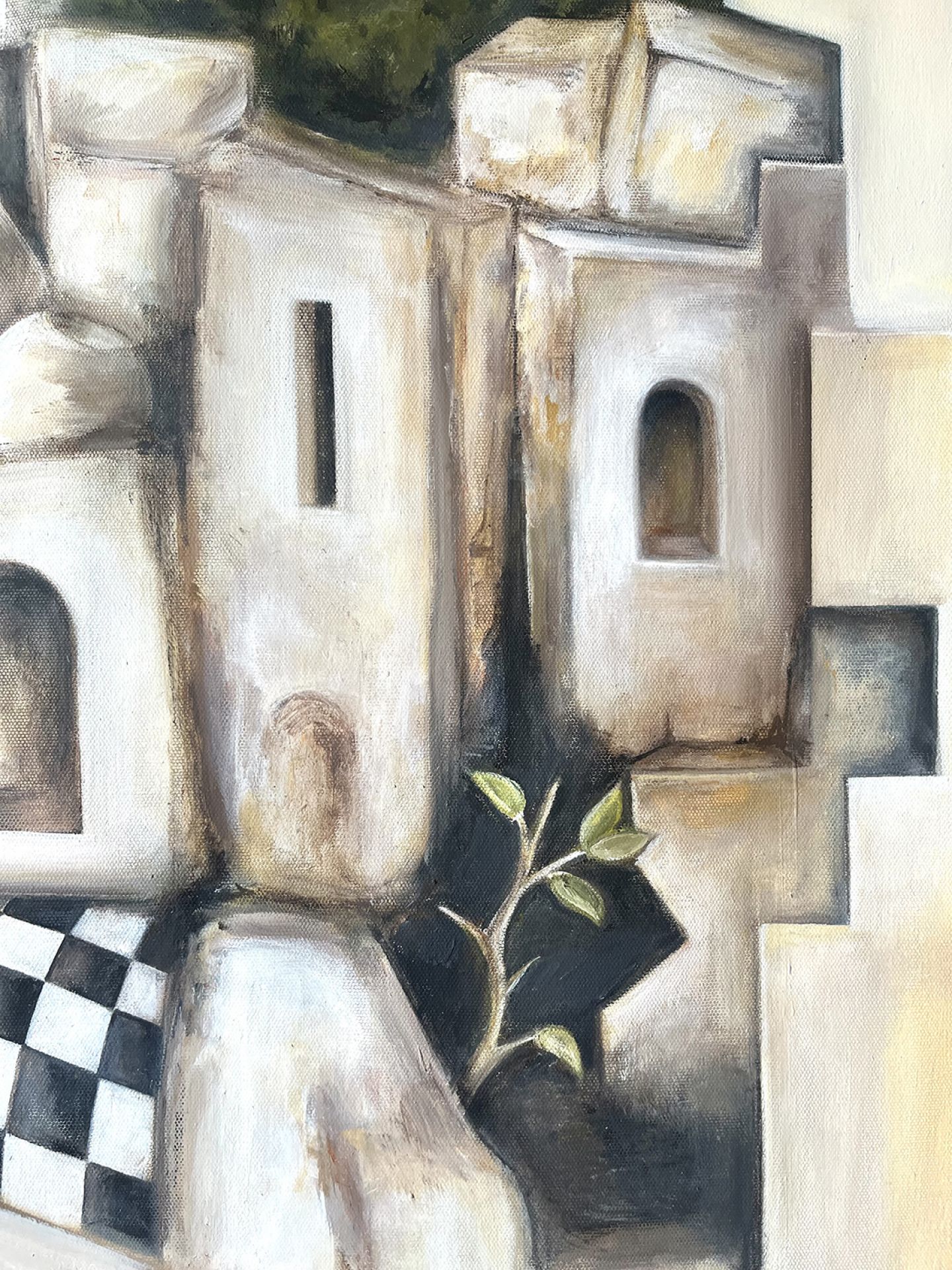 Barbara Meduri urbanizza il sogno. Architetto di formazione, qui firma una planimetria sentimentale dove il borgo mediterraneo diventa plastico di memoria. Case, calcare, archi come feritoie, un sole a rilievo che sembra una cupola scheggiata. Una luna sezionata come una sezione tecnica. Tutto è progetto e fiaba insieme. La tavolozza è di tufo, panna, ocra e latte di calce. Il verde del cipresso fa la sentinella, l'apple still life fa da complesso all'anfora. Contrappeso, misure, pesi e volumi. Poi lo scarto, pesci che volano, nuvole a mensola, una scacchiera infilata tra i vicoli come se il destino si giocasse a pedine. Utopia e realtà, la sua tesi, qui scivolano una nell'altra senza chiedere permesso. La composizione procede ad incastri senza prospettiva consolatoria; più sezione che veduta; più cantiere interiore che panorama. Il nero dei varchi apre cavità; il rametto che spunta dalla roccia che è un permesso a costruire rilasciato dalla natura. C'è ironia gentile; questa lottizzazione dell'anima funziona meglio di molte lottizzazioni reali. Meduri modella il quadro come un modellino mentale; riduce , semplifica, ordina poi sposta un elemento e lascia che il gioco inizi. Il risultato è un presepe laico dove ogni cosa sta al suo posto e intanto sogna un altrove. Domanda finale e secca : dove abiti quando sogni? Barbara suggerisce una risposta: in una città sospesa che non chiede residenza ma che pretende appartenenza.